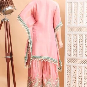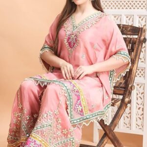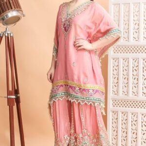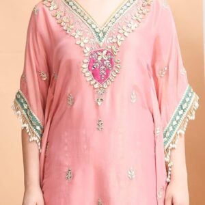 Be the first to review “Traditional Embroidered Kaftan Palazzo Set, Pink, V-Neck with Fringe Details, Floral Embellished” Cancel reply