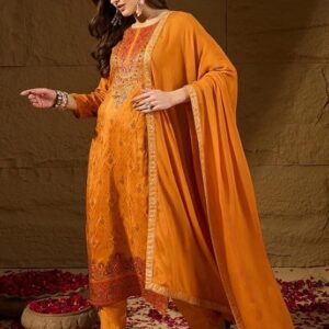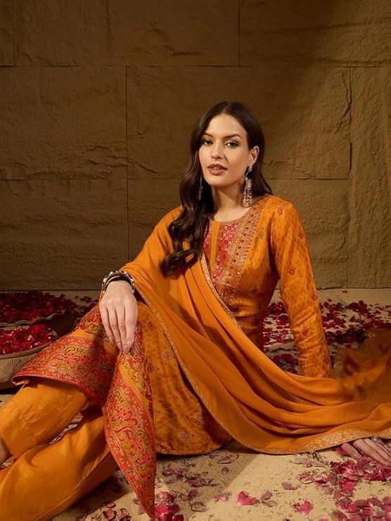 Women’s Mustard Silk Ikat Straight Woven Kurta Pant With Dupatta Set | Straight Kurta Set For Women | Woven Salwar Suit For Women